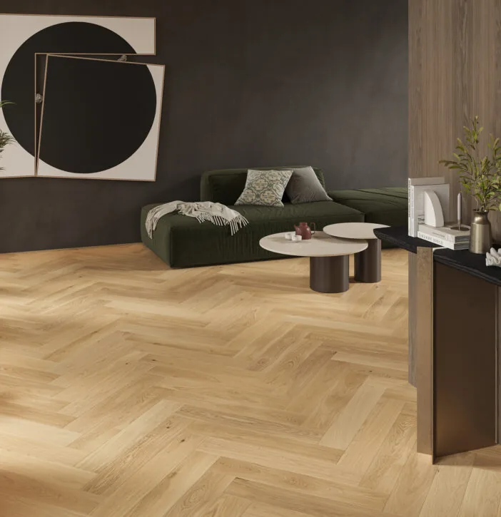 A Caramel Herringbone szálcsiszolt, ferde élű padlókból áll, ami felerősíti a nemes és hagyományos tölgyfa padló benyomását. A befejezéshez matt lakkot használnak.