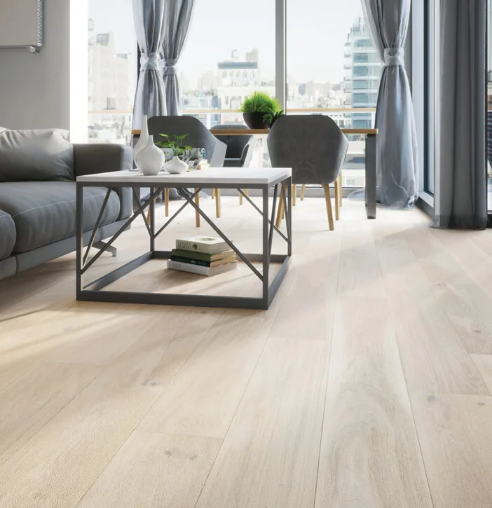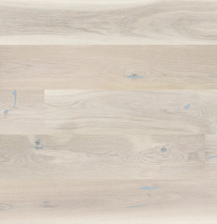 Egylamellás tölgy padló, 207 mm szélességű és 2200 mm hosszúságú, hosszanti élén fázolt. Finoman fehérített és természet által szolidan jellegzetessé tett, amit a kefés technikával is kiemeltek. Matt lakkozással készült. Ideális minimalista és modern enteriőrökbe, ahol a könnyedség és a tágasság dominál.